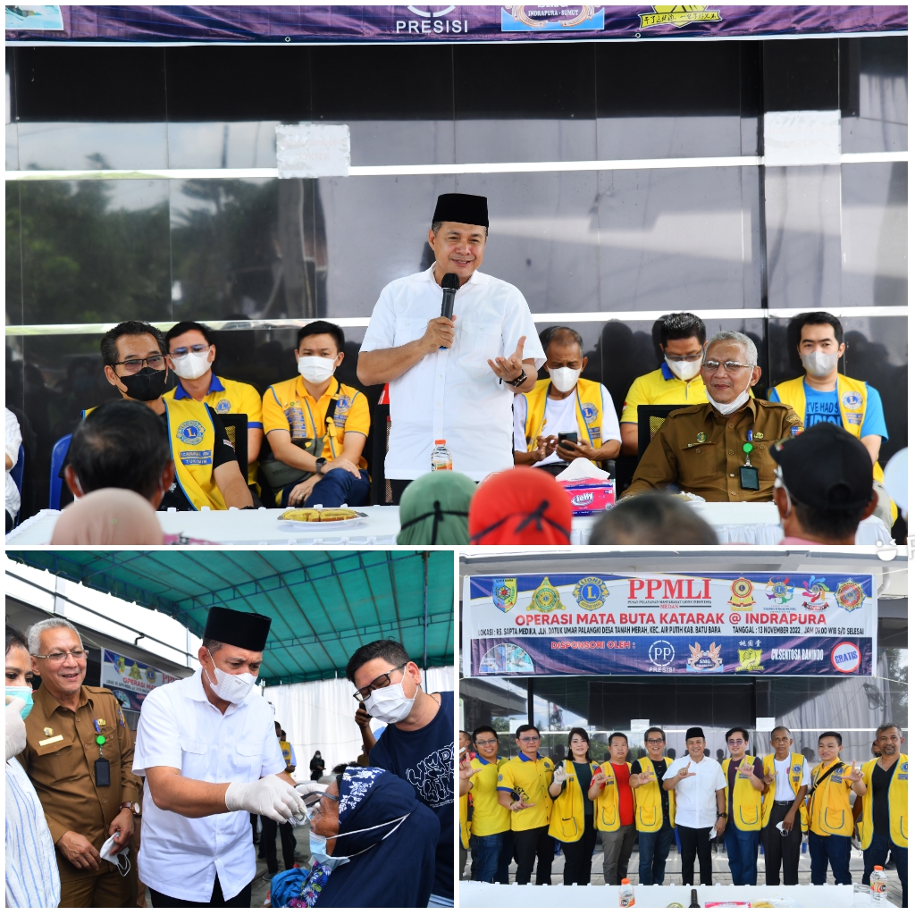 BATU BARA - Bupati Batu Bara Ir. H. Zahir, M.AP., didampingi tim medis membuka perban pasien mata katarak setelah mengikuti operasi gratis di Rumah Sakit Sapta Medika Desa Tanah Merah, Kecamatan Air Putih, Senin (14/11/2022).