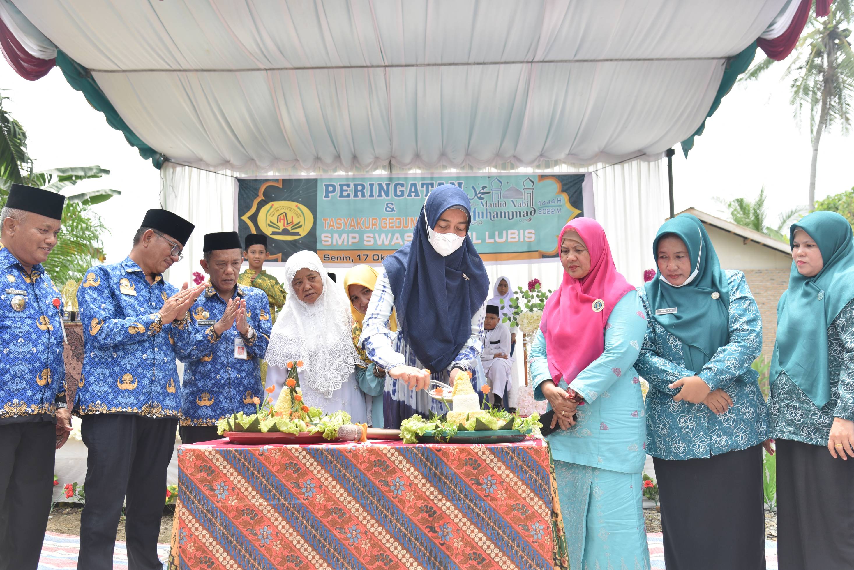 BATU BARA - Bunda Pendidikan Anak Usia Dini (PAUD) Kabupaten Batu Bara Ny. Hj. Maya Indriasari Zahir, S.E., menghadiri peresmian gedung baru SMP IT HL Lubis di Dusun I Desa Lubuk Hulu, Kecamatan Datuk Lima Puluh, Senin (17/10/2022).