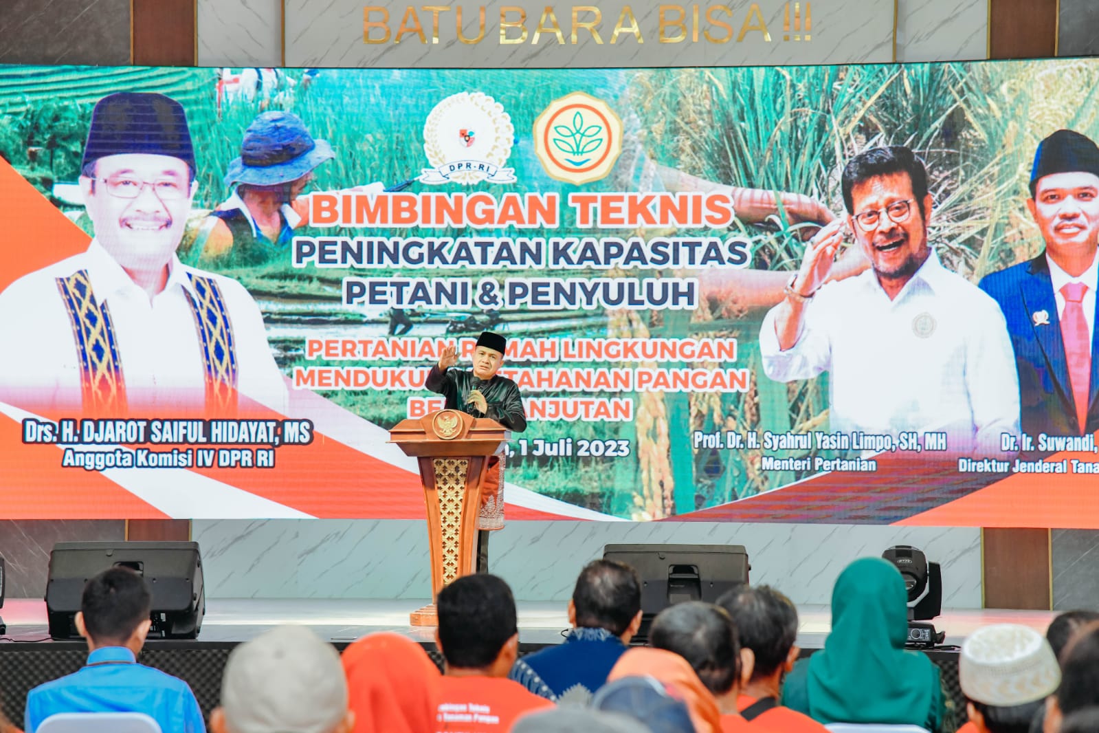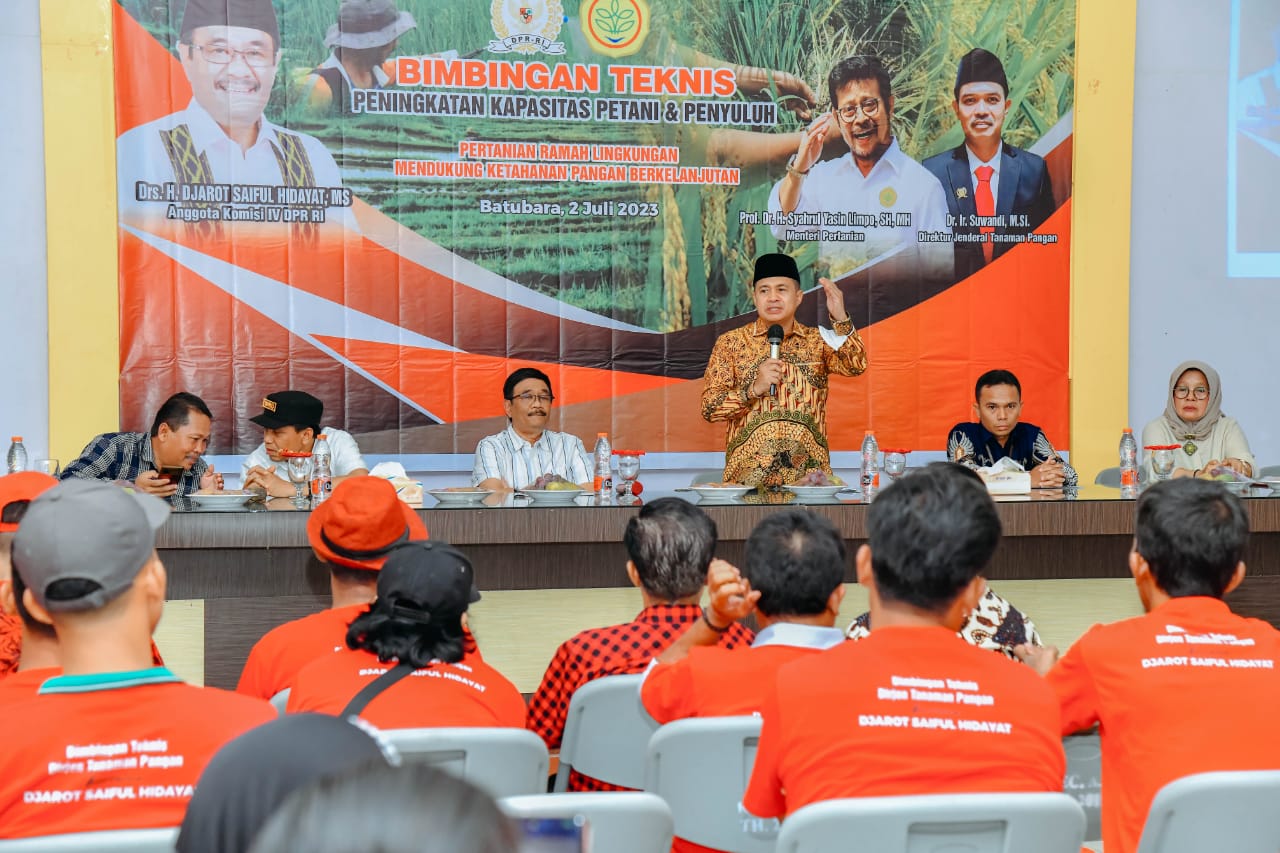 BATU BARA - Anggota Komisi IV DPR RI Fraksi PDI Perjuangan Djarot Saiful Hidayat melakukan kunjungan kerja ke Kabupaten Batu Bara untuk menemui peserta Bimbingan Teknis Peningkatan Kapasitas Petani dan Penyuluh Pertanian di Aula Kantor Camat Air P...
