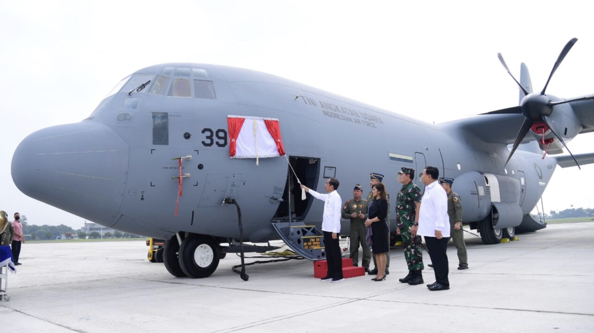 Jakarta Timur, Kominfo - Presiden Joko Widodo menyaksikan langsung penyerahan pesawat C-130J-30 Super Hercules A-1339 dan C-130H A-1315 oleh Menteri Pertahanan Prabowo Subianto kepada Panglima TNI Laksamana Yudo Margono. Acara penyerahan digelar d...