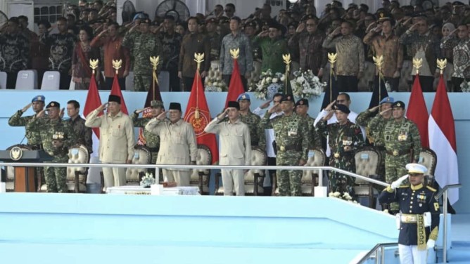 Jakarta Pusat, Komdigi - Presiden Prabowo Subianto bertindak sebagai inspektur upacara dalam Upacara Peringatan Hari Ulang Tahun (HUT) ke-80 Tentara Nasional Indonesia (TNI) yang digelar di Lapangan Silang Monumen Nasional (Monas), Jakarta Pusat,...