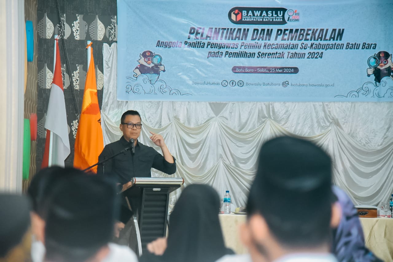 BATU BARA - Pj. Bupati Batu Bara Nizhamul hadiri acara pelantikan dan pembekalan pengambilan sumpah dan janji Panitia Pengawas Pemilu (Panwaslu) se-Kecamatan Kabupaten Batu Bara pada pilkada serentak 2024. Acara digelar di Aula Singapore Land, Kec...