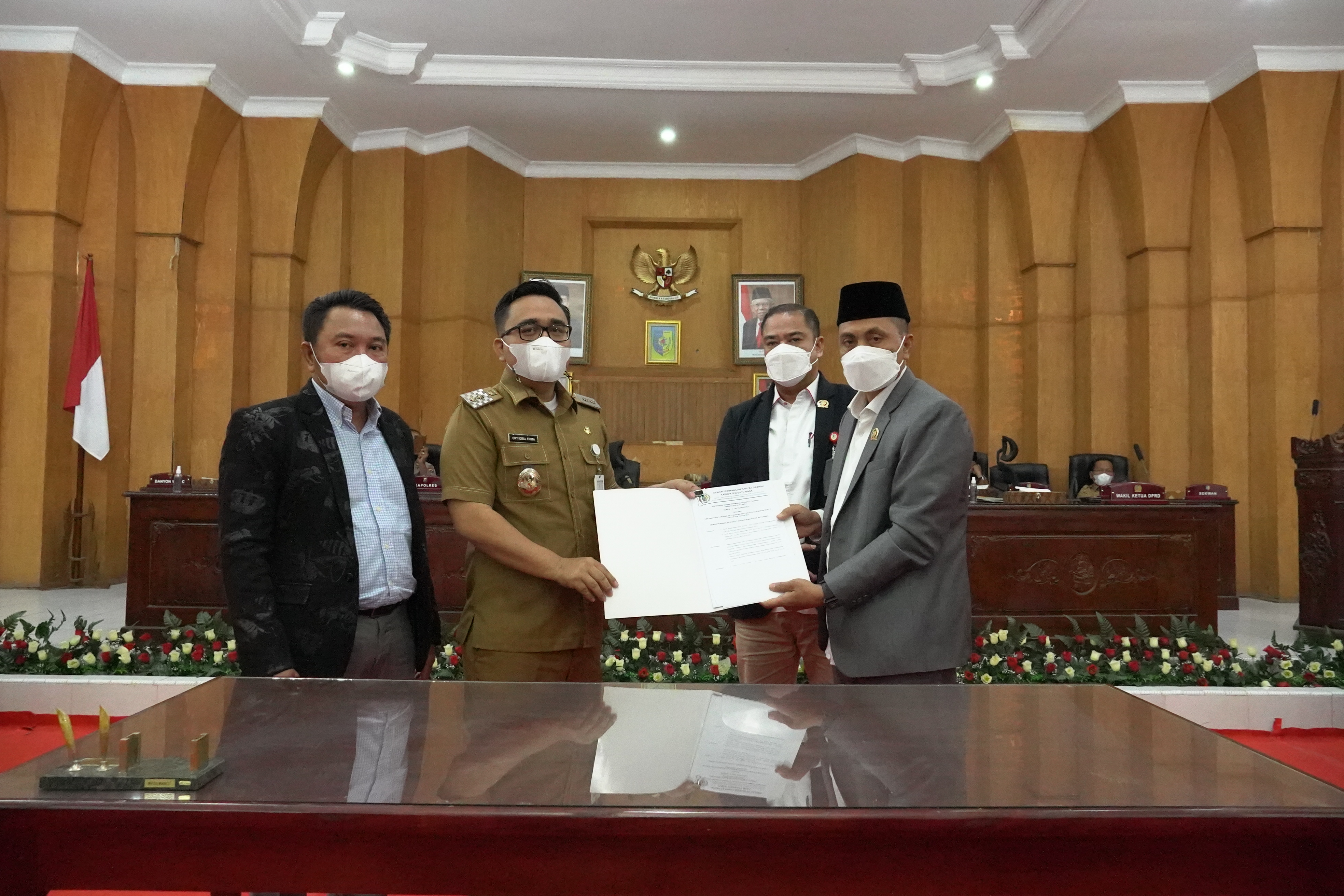 Rapat Paripurna Laporan Hasil dengan agenda pendapat akhir fraksi dan pengambilan keputusan bersama terhadap 3 Rancangan Peraturan Daerah (Ranperda), dihadiri oleh Wakil Bupati Kabupaten Batu Bara, Oky Iqbal Frima, yang digelar d...