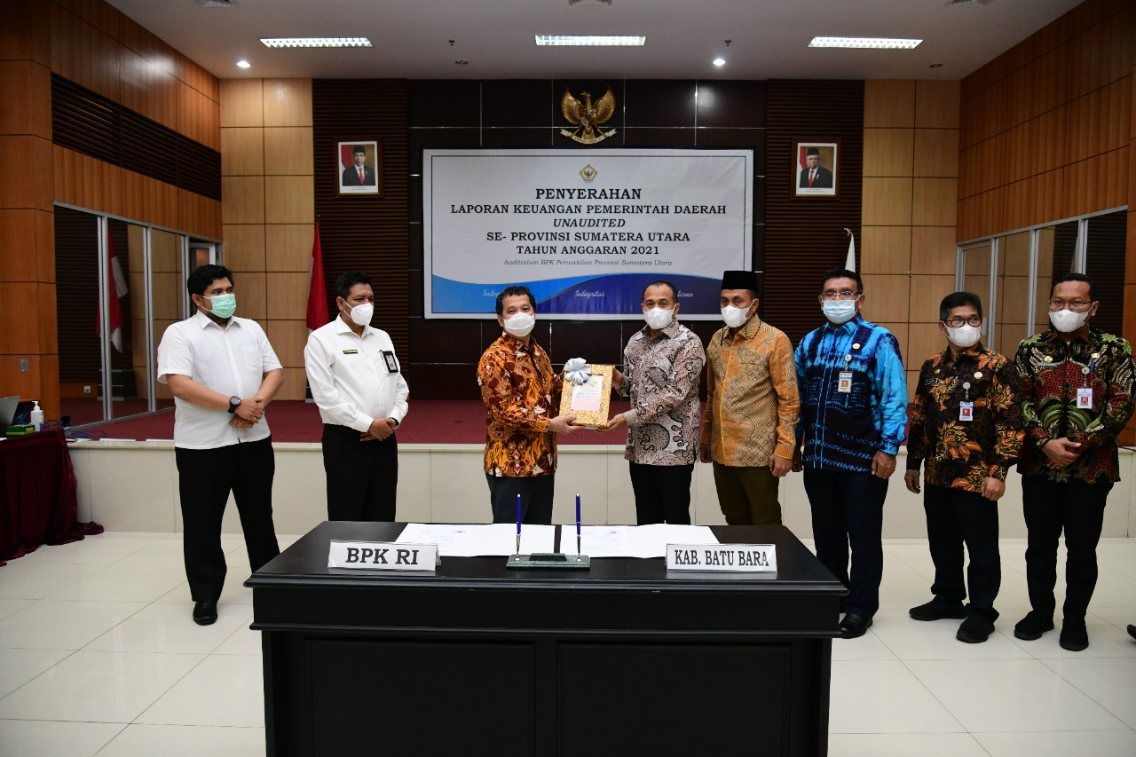 Bupati Batu Bara Ir. H. Zahir, M.AP, menyerahkan Laporan Keuangan Pemerintah Daerah (LKPD) Un-Audited Kabupaten Batu Bara Tahun Anggaran 2021, kepada Kepala Badan Pemeriksa Keuangan (BPK) Provinsi Sumatera Utara, di Auditorium BP...
