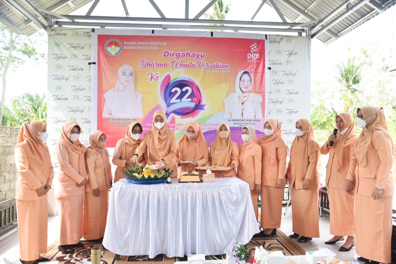 Dharma Wanita Persatuan (DWP) Kabupaten Batu Bara memperingati HUT ke - 22 Tahun di Pesantren Tahfiz Quran Pondok Darul Desa Titi Payung Kecamatan Air Putih, Selasa (28/12/2021).