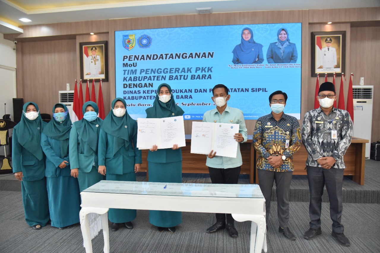 Ketua Tim Penggerak Pemberdayaan dan Kesejahteraan Keluarga (TP PKK) Kabupaten Batu Bara Ny. Maya Indriasari Zahir dan Kadis Dukcapil Maeda Soetopo, S.STP, M.SP melakukan MoU atau perjanjian kerja sama di Aula Rumah Dinas Bupati...