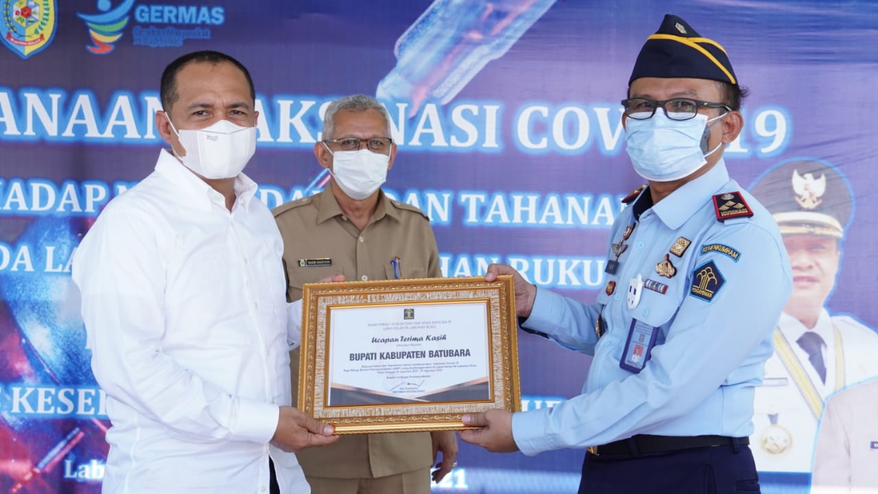 Bupati Batu Bara Ir. H. Zahir MAP didampingi Kadis Kesehatan Drg. Wahid Khusayri, Camat Talawi Muliadi, SE dan Kepala Lapas Labuhan Ruku Yan Rusmanto BC. IP, S.Sos, M.Si memantau kegiatan vaksinasi kepada warga binaan di La...