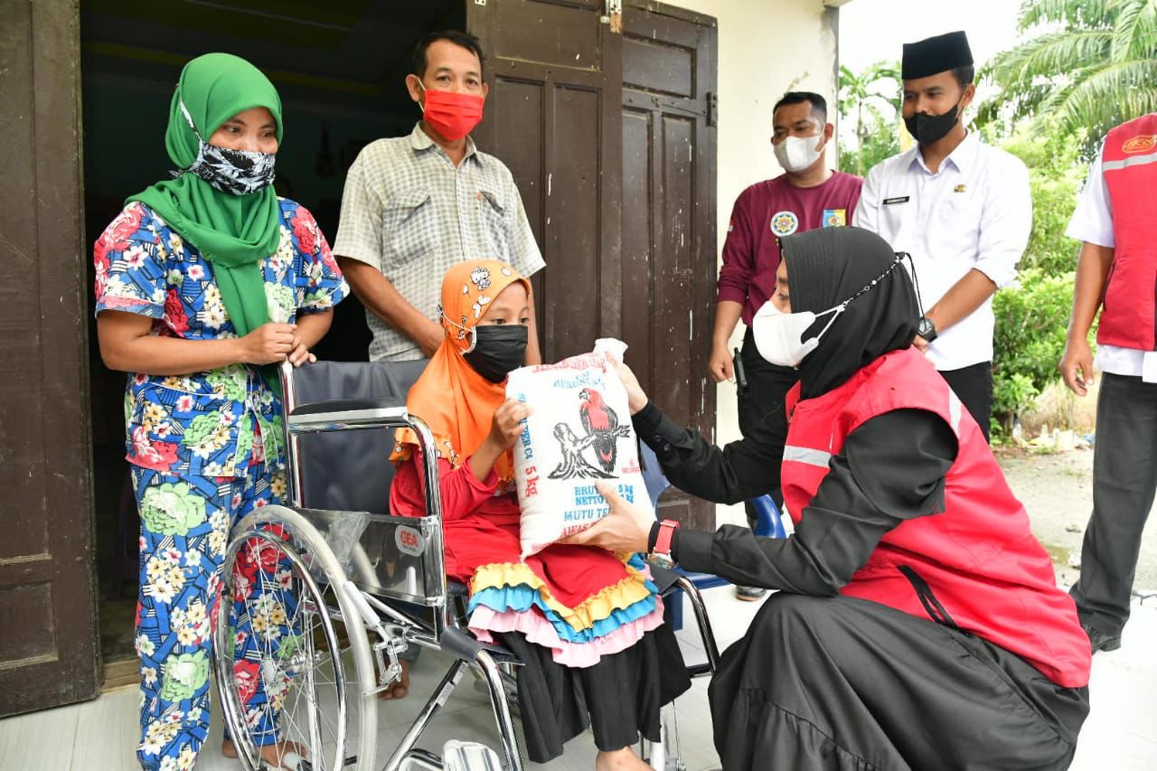 Ketua BK3S Kabupaten Batu Bara Ny. Maya Zahir salurkan bantuan kursi roda kepada seorang lansia dan anak disabilitas. Desa Pulau Sejuk Kecamatan Datuk Lima Puluh. Rabu (18/08/2021).