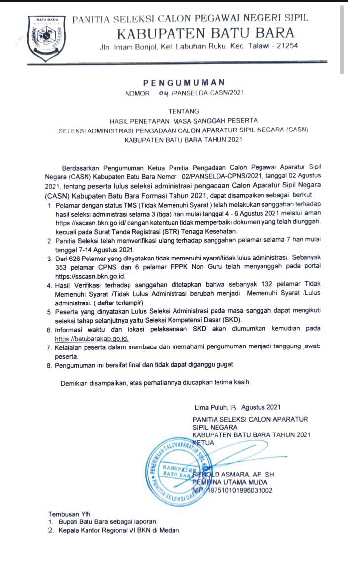 Berdasarkan Pengumuman Ketua Panitia Pengadaan Calon Pegawai Aparatur Sipil Negara (CASN) Kabupaten Batu Bara Nomor 02/PANSELDA-CPNS/2021, tanggal 02 Agustus 2021, tentang peserta lulus seleksi administrasi pengadaan Calon Aparat...
