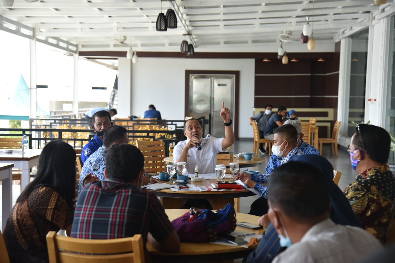 Bupati Batu Bara Ir. H. Zahir, M.AP didampingi Asisten I Russian Heri memanggil para Kepala Desa di Hotel Singapore Land, Kecamatan Sei Suka. Kamis (17/06/2021).