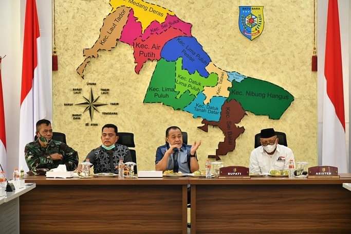 Rakor dalam rangka sinkronisasi langkah penertiban pasar tradisional dan pasar ikan Tanjung Tiram dilaksanakan di Aula Rumah Dinas Bupati, Komplek Tanjung Gading. Sabtu (22/05/2021).