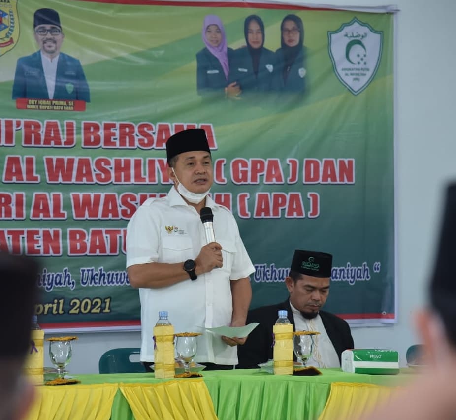 Bupati Batu Bara Ir. H Zahir, M.AP didampingi Kabag Kesra Adenan Haris menghadiri acara peringatan Isra mi\'raj di Aula Sekolah Al-washliyah Indrapura, Kecamatan Air Putih, jumat (09/04/2021).