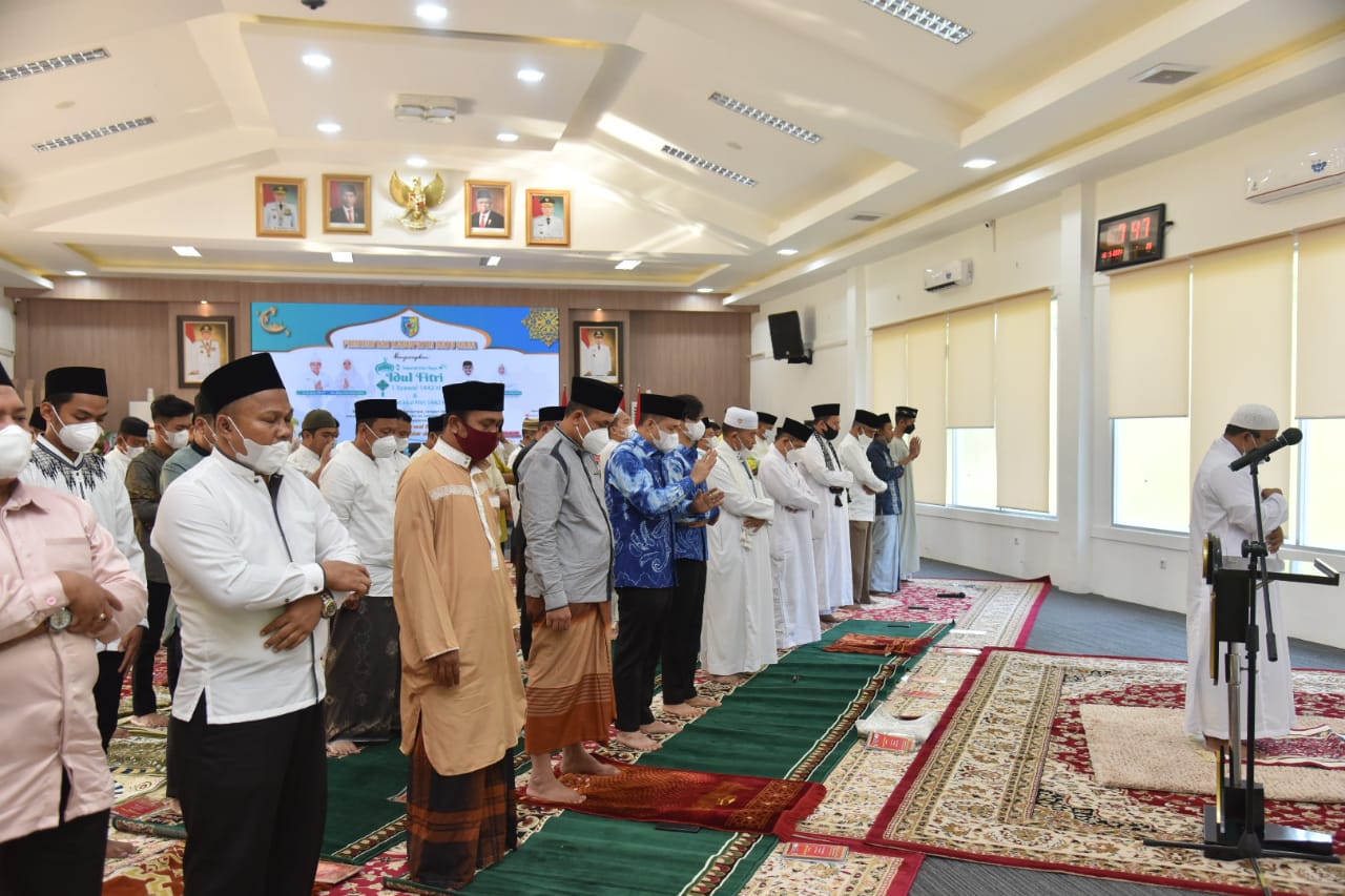 Sholat Idul Fitri ini dilaksanakan di Aula Rumah Dinas Bupati Komplek Tanjung Gading, dengan tetap menerapkan protokol kesehatan. Kamis (13/05/2021).