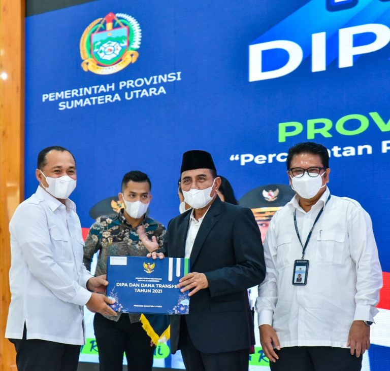 Gubernur Sumatera Utara (Sumut) Edy Rahmayadi menyerahkan dokumen Daftar Isian Pelaksanaan Anggaran (DIPA) dan Transfer Ke Daerah dan Dana Desa (TKDD) Tahun 2021 kepada satuan kerja (Satker) dan pemerintah kabupaten/kota se...