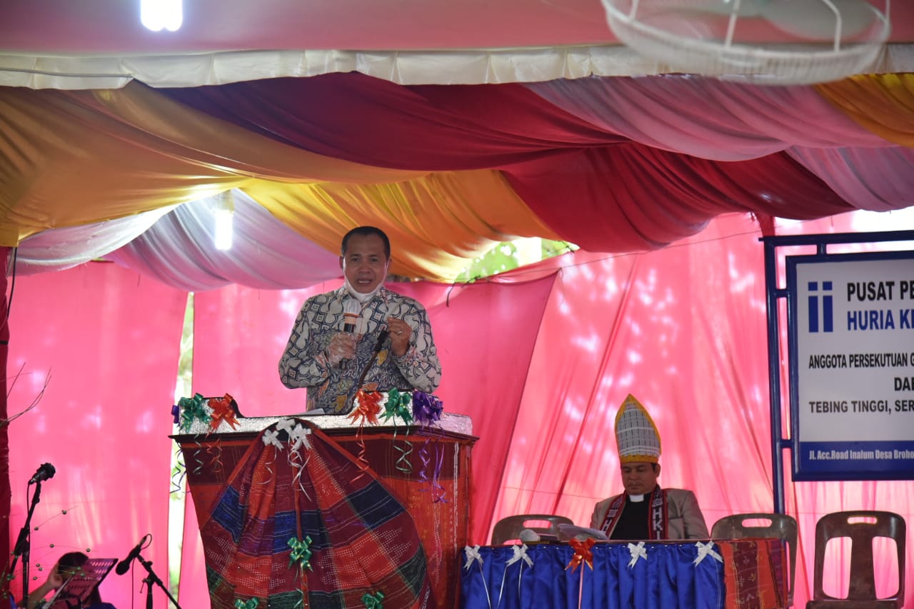 Bupati Batu Bara Ir. H. Zahir, M.AP di dampingi ketua DPRD Batu Bara Safi’i bersama Asisten II Sahala Nainggolan meresmikan Gereja Imanuel HKI Brohol di Kecamatan Sei Suka, Minggu (1/11/2020) yang di hadiri ephorus Pdt MP H...