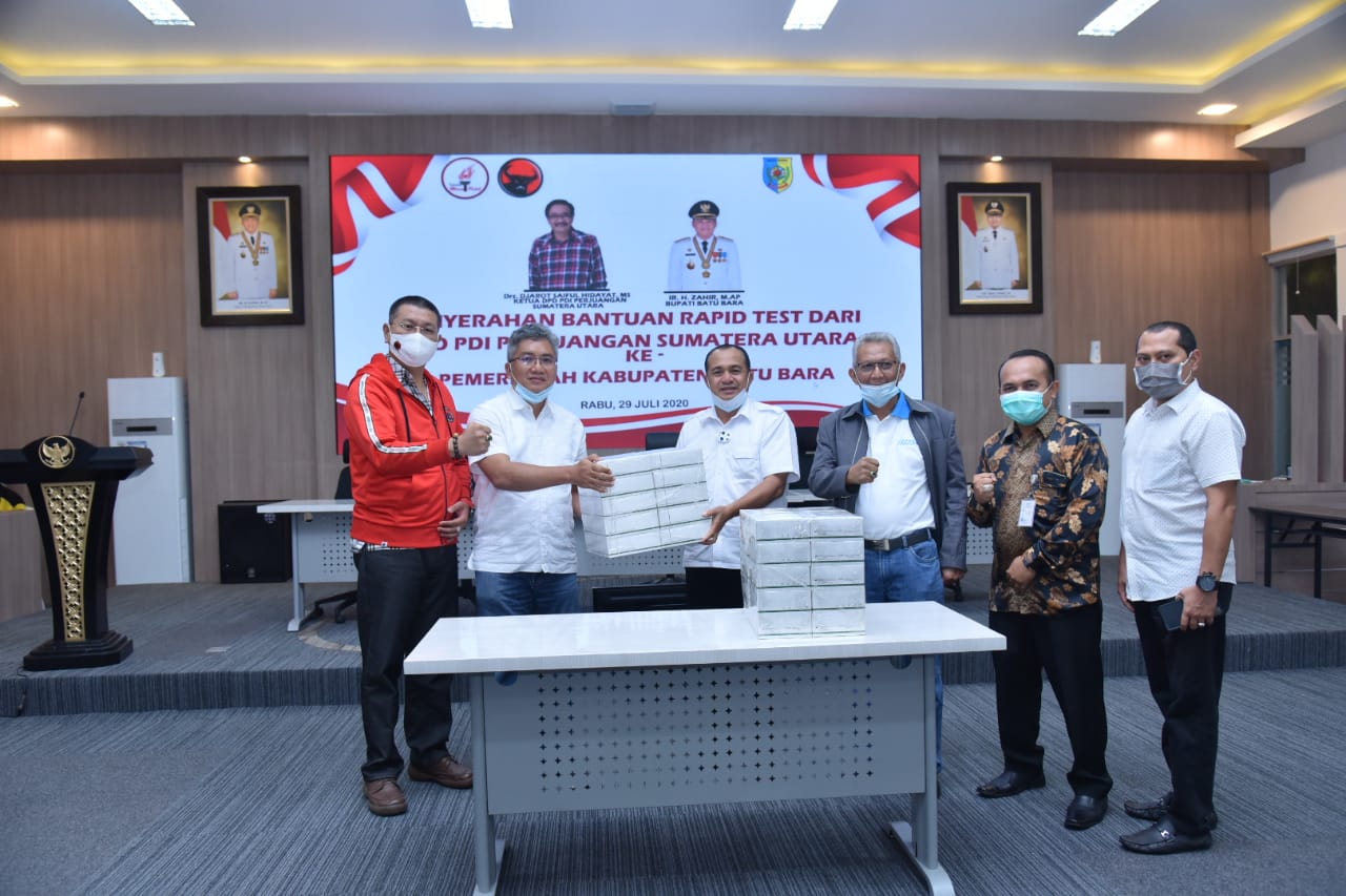 Ketua DPD PDI – P Sumut diwakili Pengurus, Sugianto Makmur dan Darmo yang juga sebagai anggota DPRD Sumut menyerahkan Sebanyak 1000 pcs alat rapid test pada Bupati Batu Bara.