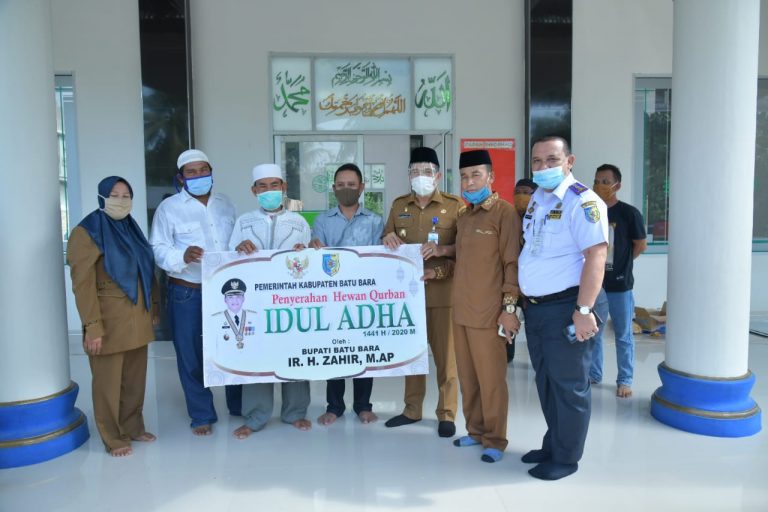 Bupati Batu Bara Ir. H.Zahir, M.AP yang didampingi Kabag kesra Adnan Haris menyerahkan papan simbolis hewan qurban menyambut hari raya Idul Adha 1441 H/2020 M di Masjid masjdi yang berada di wilayah Kecamatan Lima puluh Kabupaten...