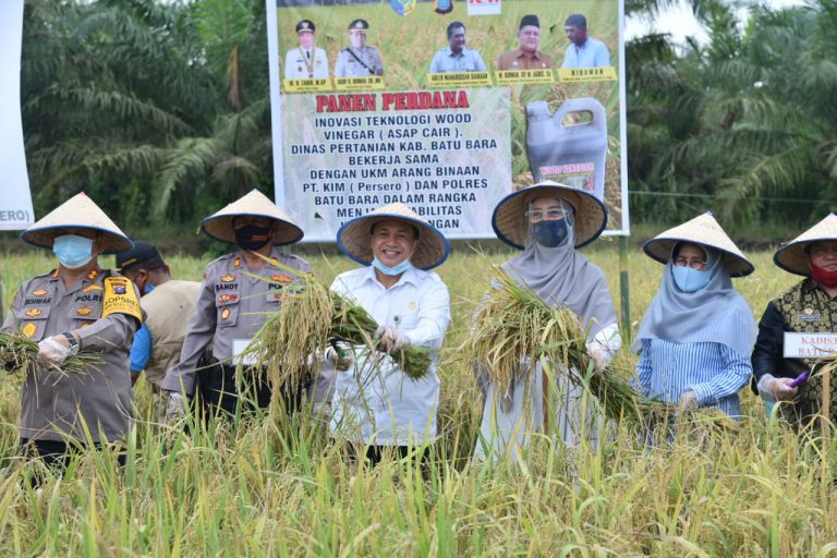 Bupati Ir. H. Zahir, M.AP bersama Kapolres Batu Bara AKBP Ikhwan Lubis panen perdana padi sawah yang berinovasi teknologi wood vinegar, dinas pertanian yang bekerjasama dengan UKM arang binaan PT KIM (Persero) di Desa Tanjung Mud...