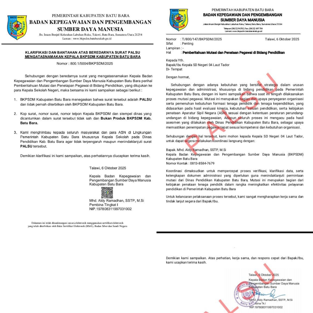 Sehubungan dengan beredarnya surat yang mengatasnamakan Badan Kepegawaian dan Pengembangan Sumber Daya Manusia (BKPSDM) Kabupaten Batu Bara deng...